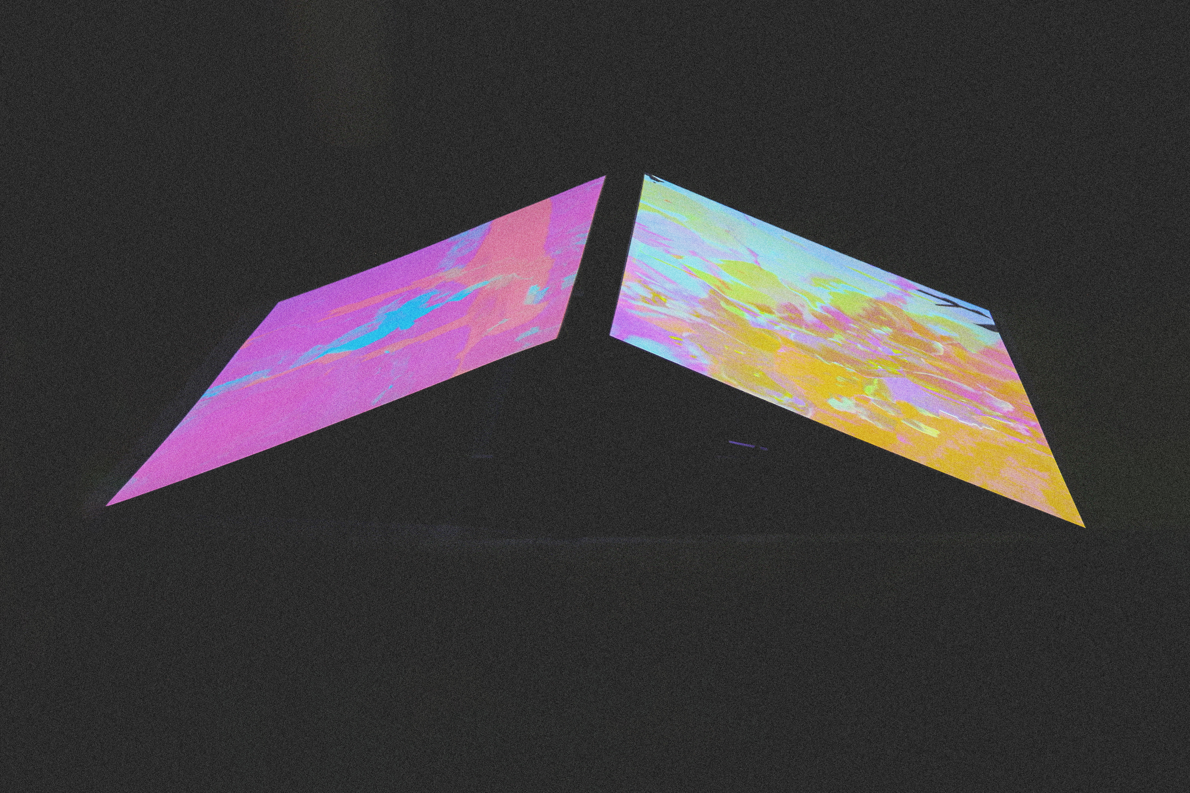 4:3 projections on inclined screens. Two speakers below, standing in the space between the screens, facing out.